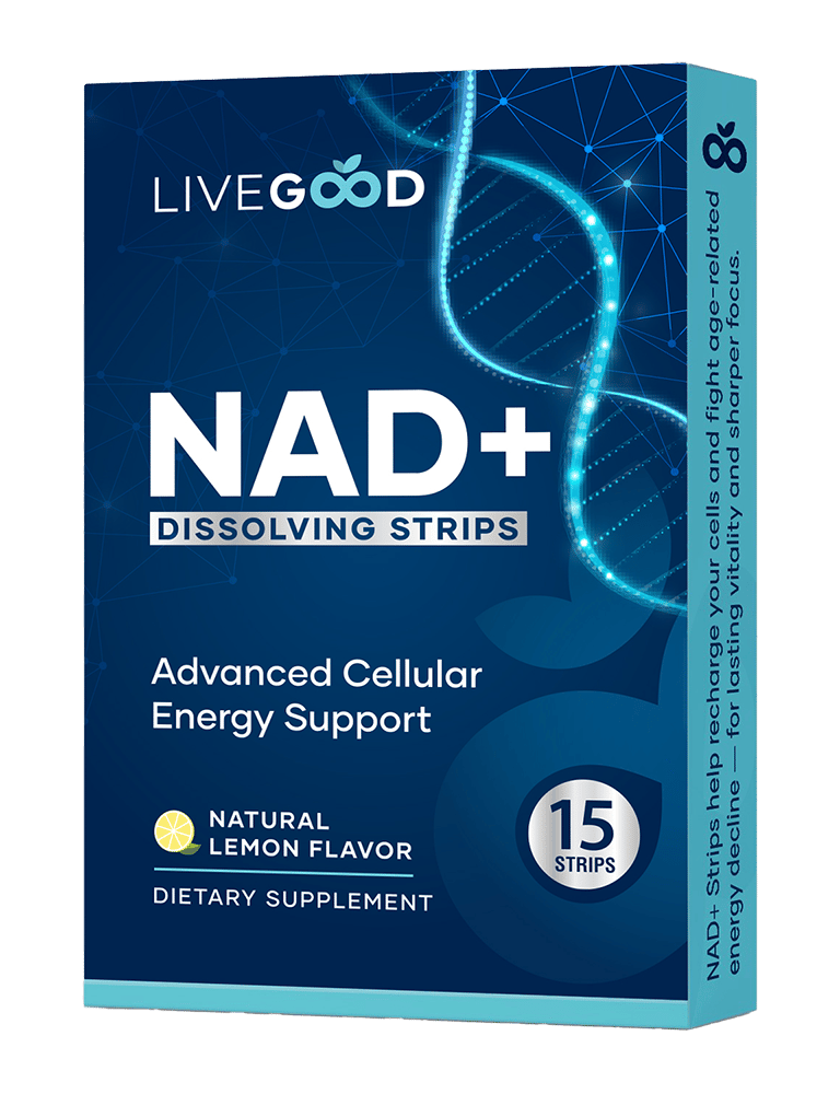 Las tiras disolubles LiveGood NAD+ están diseñadas para ayudar a mantener niveles saludables de NAD+ , para que sus células puedan funcionar de la mejor manera.